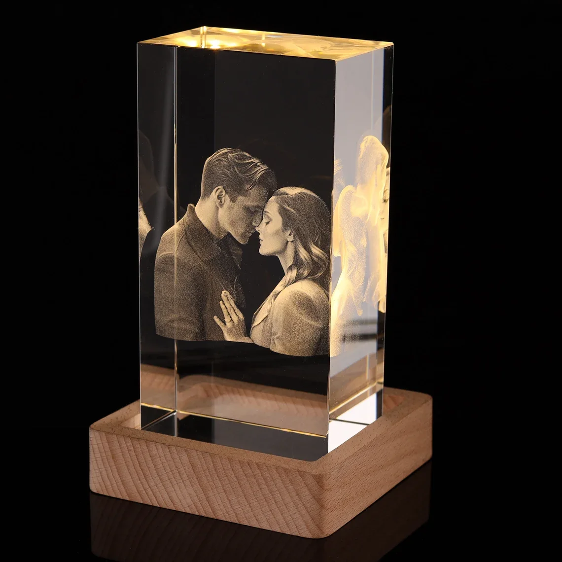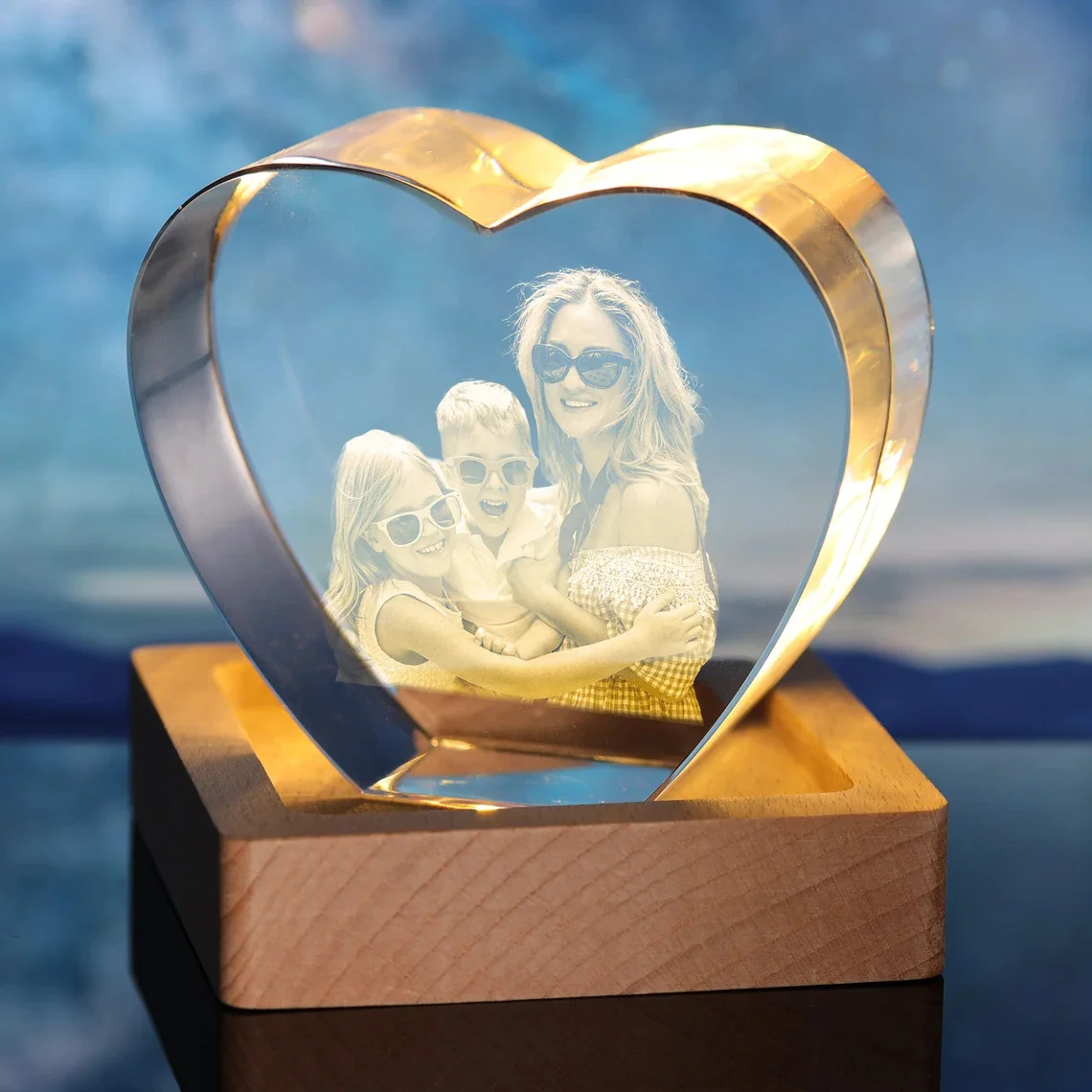 3D-Kristallfoto Herzförmig Mit Leuchtbasis | Personalisiertes Maßgeschneidertes Glas-Lasergraviertes Foto